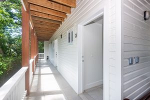 rooms with private bathrooms and balconies, and a common lounge area.