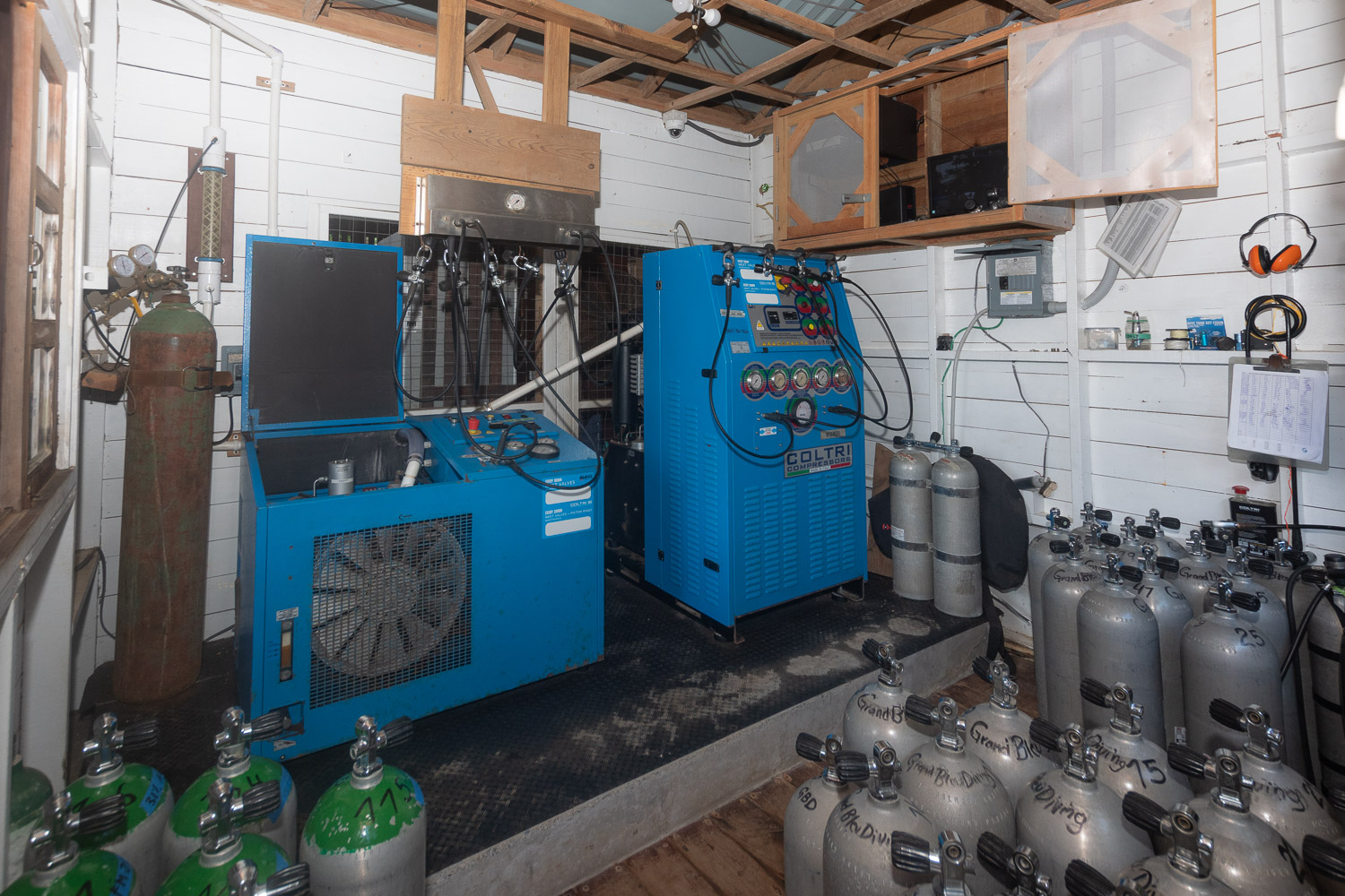 equipment includes a Coltri MCH16 air/nitrox compressor, a Coltri MCH22