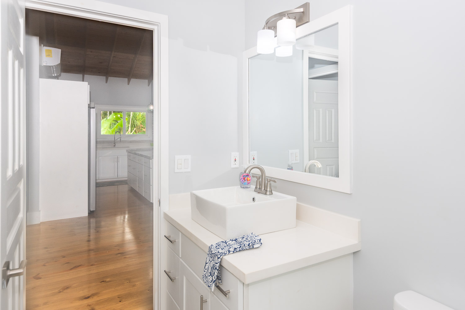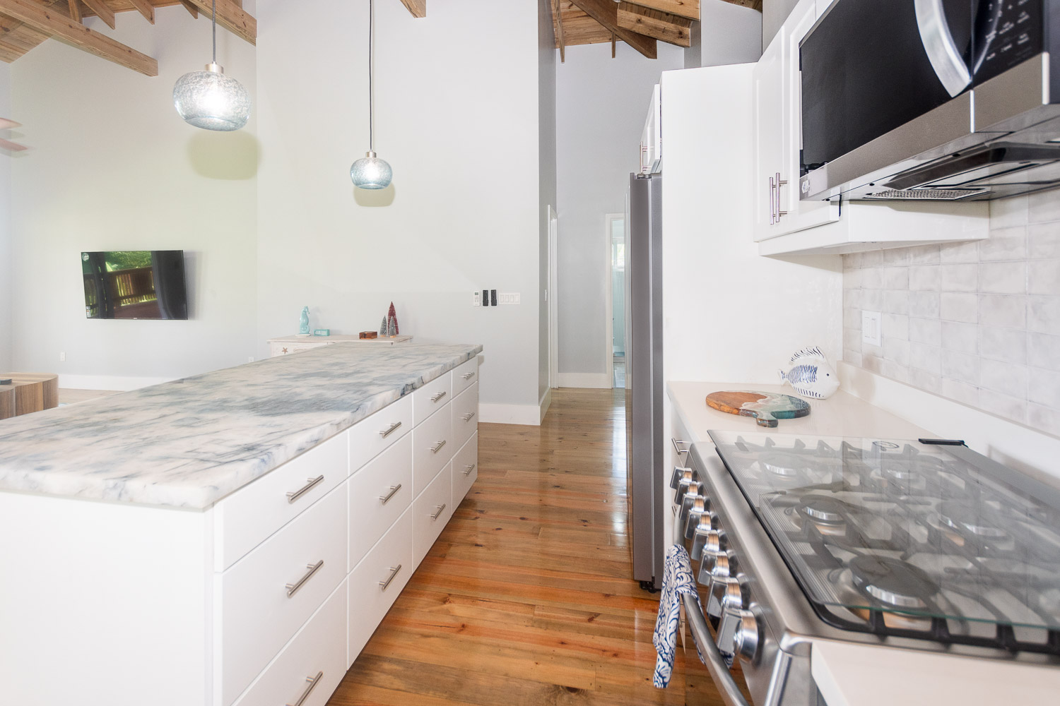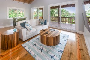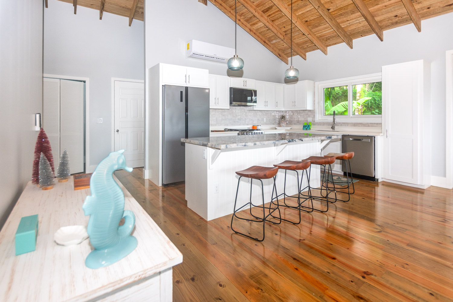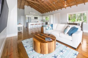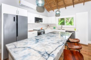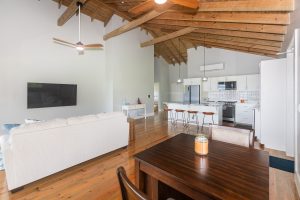 cooling cross-breezes from large sliding glass doors. The modern kitchen