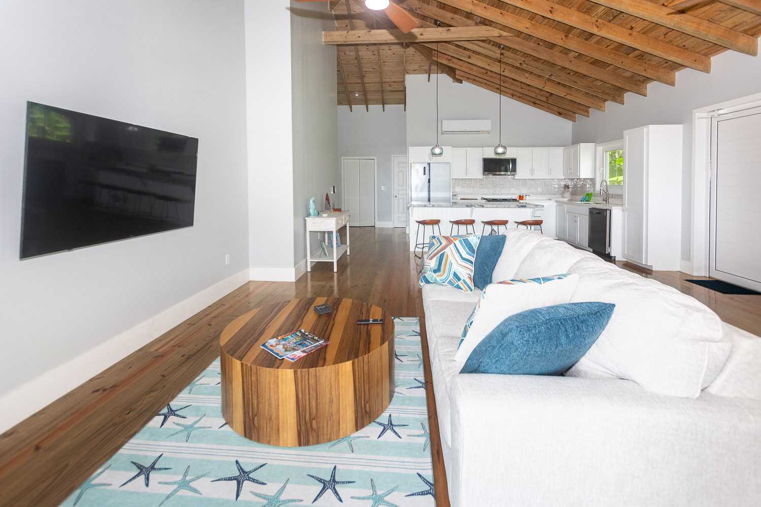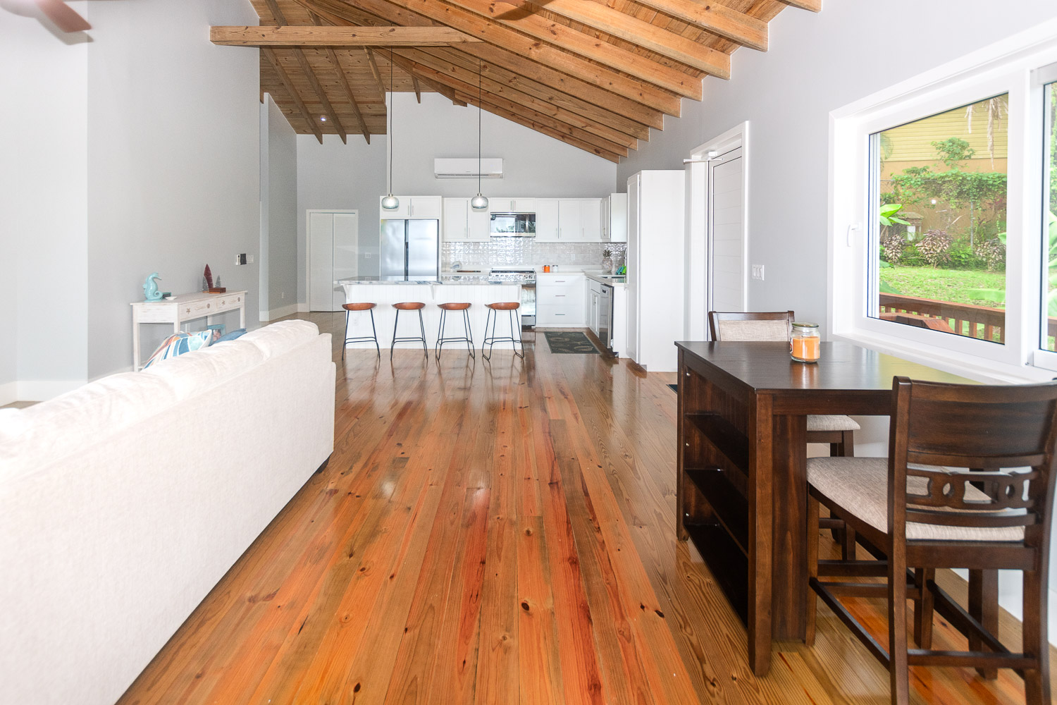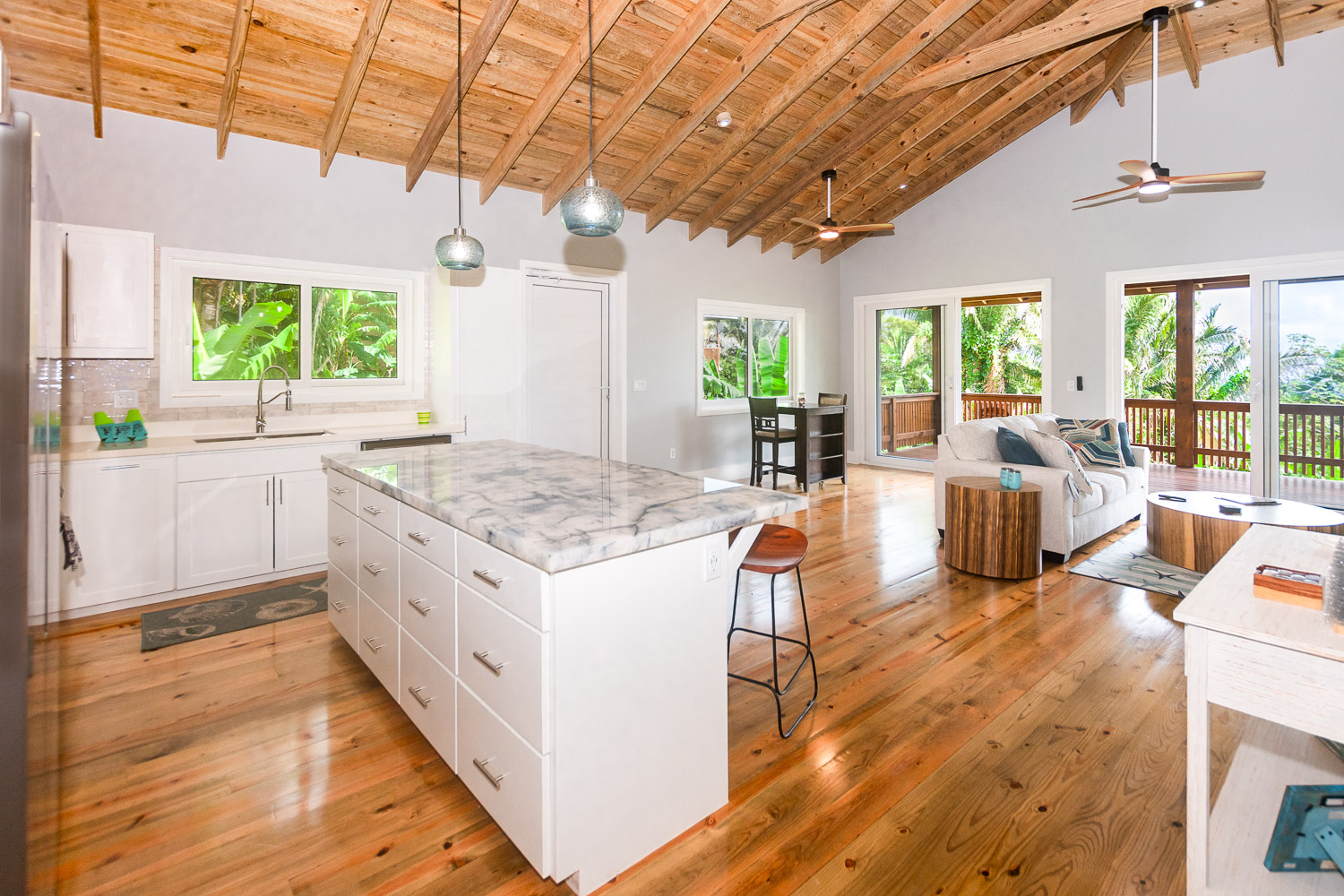 Inside, the open-concept living, dining, and kitchen areas