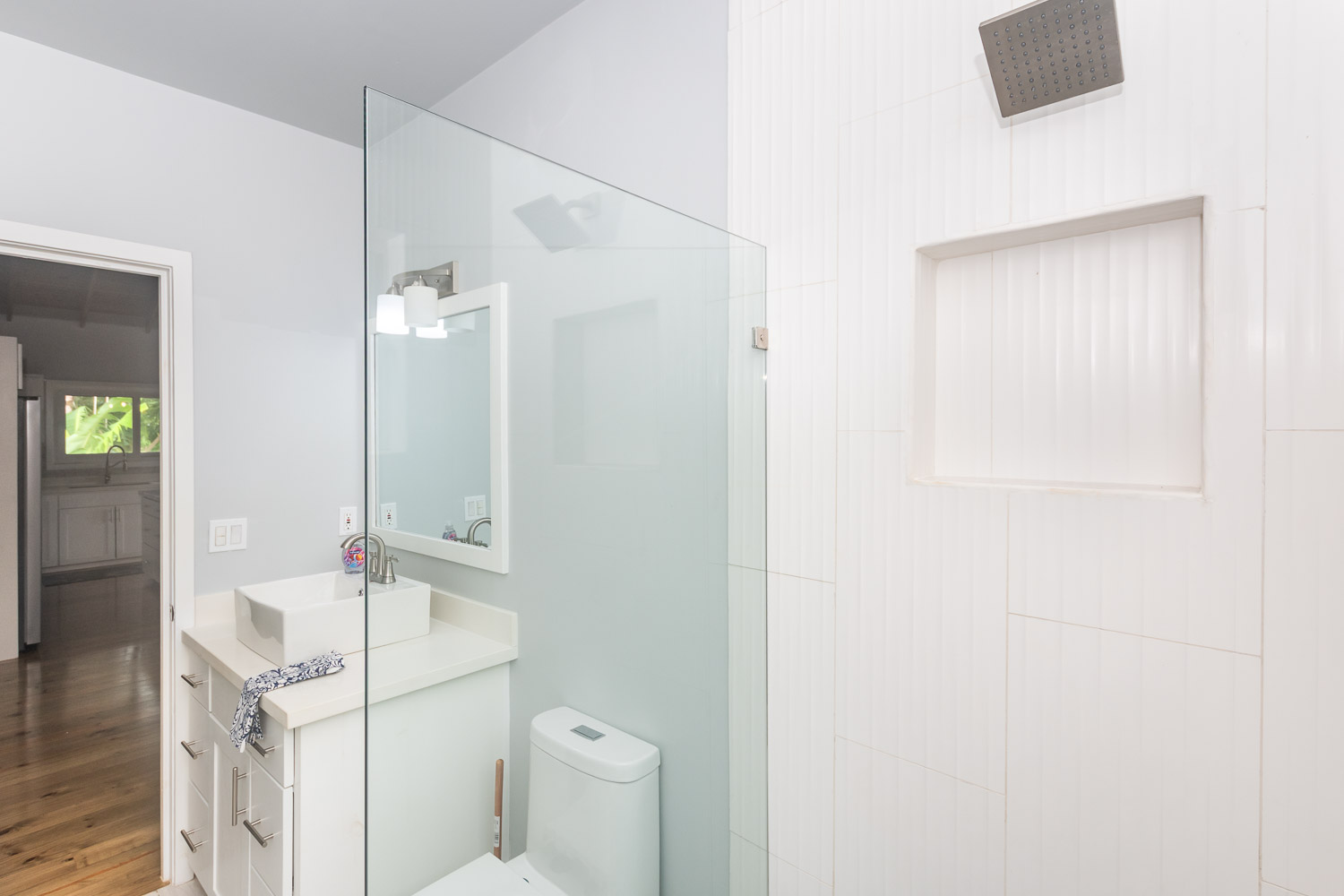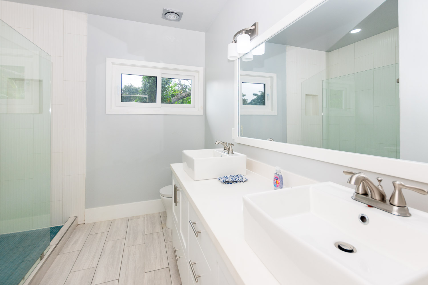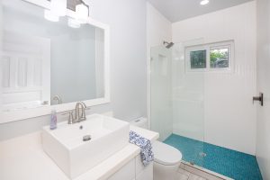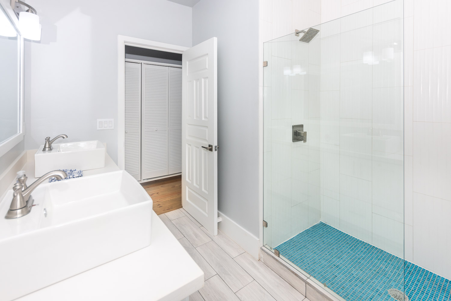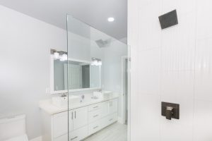 clean, modern fixtures, floating vanities, quartz countertops, and tiled
